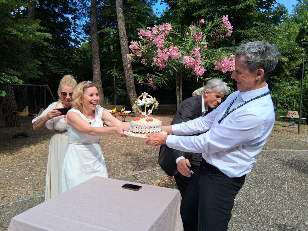 A local restaurant was booked for a long and lazy lunch after the service and a wedding cake was baked. It was June and cherries were in season so the cake was filled with fresh juicy cherries, mascarpone cream and the local ratafia cherry liqueur. Seasonal and delicious flavours and a perfect way to end their special day.
