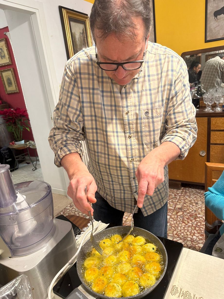 A day to remember for a very long time and for many different reasons. We started with Anna who accompanied us to discover the 18th century Palazzo Ferri hosting the amazing collection of artworks produced by the famous artist Aligi Sassu. We barely touched the surface so definitely we will be back for more. We then joined Gabriella at her B&B "Ex Albergo Centrale", very nice indeed.. Here we were introduced to the traditional recipe of the Pallotte Cacio e Ove by Amalia who read it in Adruzzese dialect, a very nice surprise. We then followed Gabriella, rolled our sleeves up and start preparing "Li Pallotte". Alittle break half way throguh for a little tasting of local pecorino cheese, salame al pepe, and a glass of local vino. We watched Gabriella whilst she was preparing the tomato sauce in which the Pallotte, the traditional delicious cheese & egg puf balls first deep fried and then cooked for 10/15 minutes in a nice, thick tomato sauce. We finally tasted and thoroughly enjoyed our hard work and we even got to take some home.