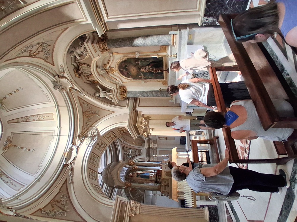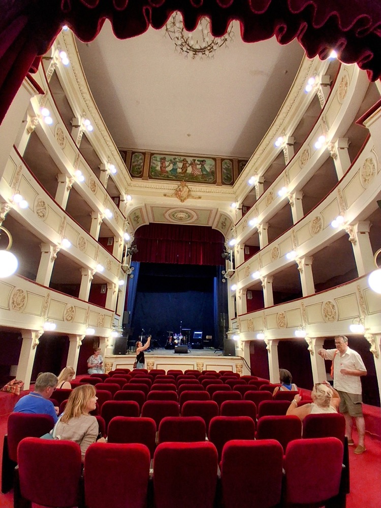 After history and religion, it was time for a bit of culture—and the town’s theatre was a little gem. It was opened especially for our visit, and we were delighted to find a perfect example of Art Deco, modelled on the famous Teatro alla Scala in Milan. It was absolutely beautiful: red velvet and gold with opulent lighting, and the town’s emblem—the dragon—sitting prettily above the entranceway. It is well worth visiting for a concert; with only 200 seats, it is intimate and charming, and the décor alone is worth gazing at for an hour or two.